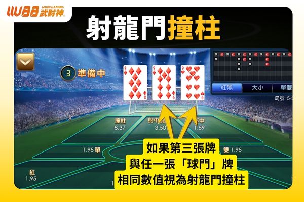 如果第三張牌與任一張「球門」牌相同數值,視為射龍門撞柱,賠率高達 8.37 倍,是線上射龍門中高風險高報酬的玩法之一。