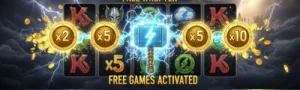 除了基本轉動玩法之外,《雷神之錘2:雷霆風暴》最受玩家期待的,就是進入免費遊戲(Free Game)模式與啟動雷擊強化機制的瞬間!這兩大爆分重點不只提高中獎機會,更是讓玩家輕鬆突破高倍倍率的關鍵核心。以下帶你了解這些進階玩法是如何幫你打出一波爆擊!